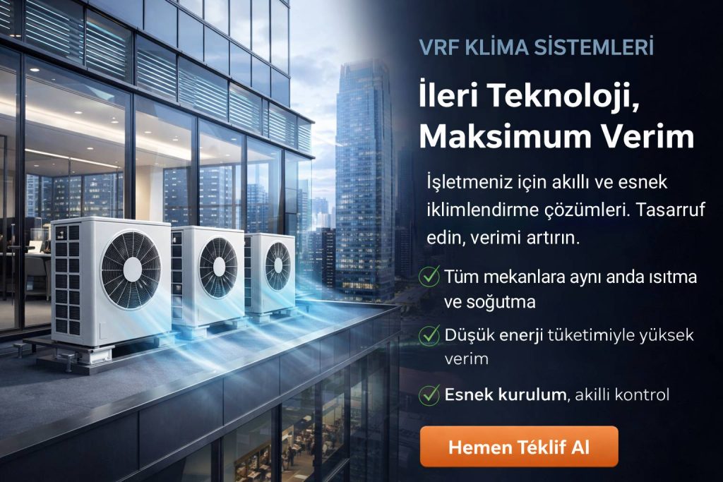 VRF klima sistemleri; ofisler, oteller, AVM’ler, hastaneler ve ticari projeler için yüksek verim, esnek kontrol ve ciddi enerji tasarrufu sağlar.